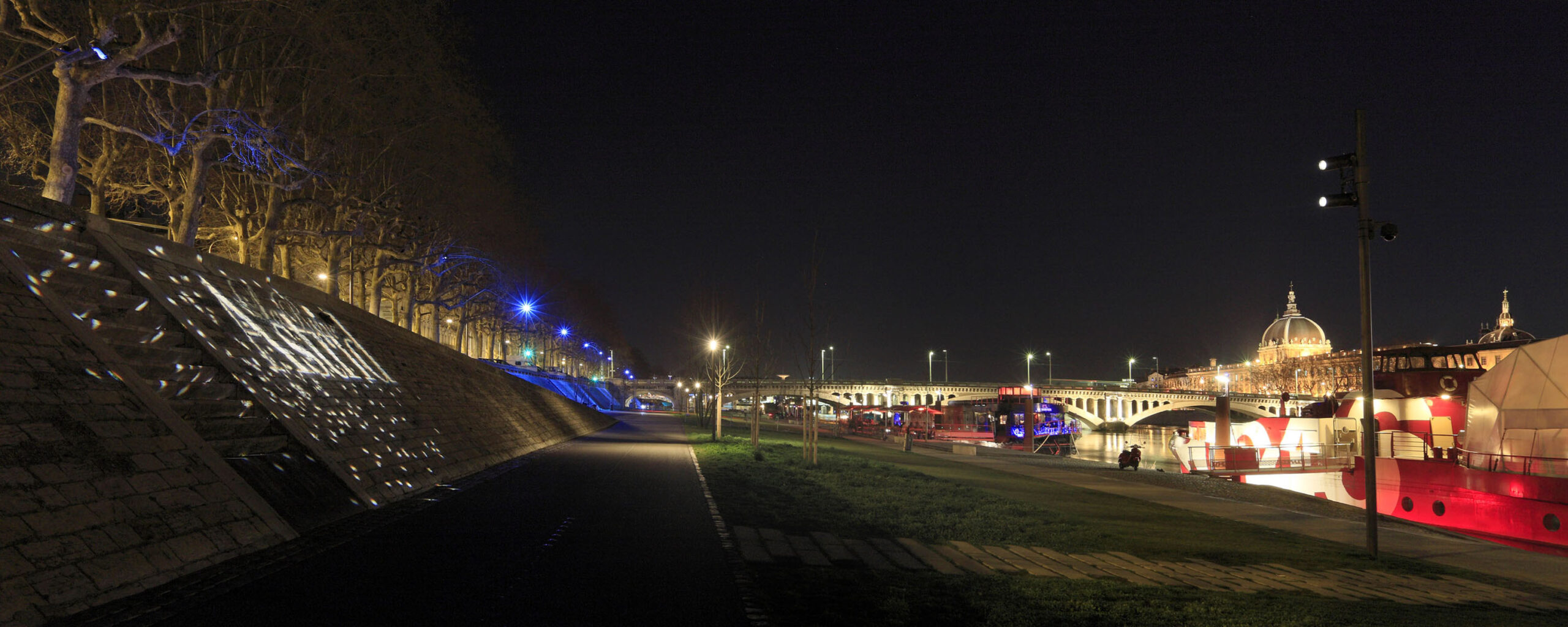 Les trois principes constitutifs de l’aménagement lumière s’enracinent dans l’identité du lit majeur du fleuve. Le mur perré, sinusoïde à la fois rudimentaire et monumentale, protège la ville de l’impétuosité du fleuve et endosse la fonction symbolique de témoin de la sédimentation historique de Lyon. La nuit métamorphose ce rempart de l’insouciance riveraine en une cimaise enrubannée de clair de lune. Les ducs d’Albe, réinventés en sentinelles lumineuses, scandent la promenade de jalons robustes, capables de résister aux caprices du Rhône. Ponctuation régulière et stable, leur ligne offre l’assurance d’une main